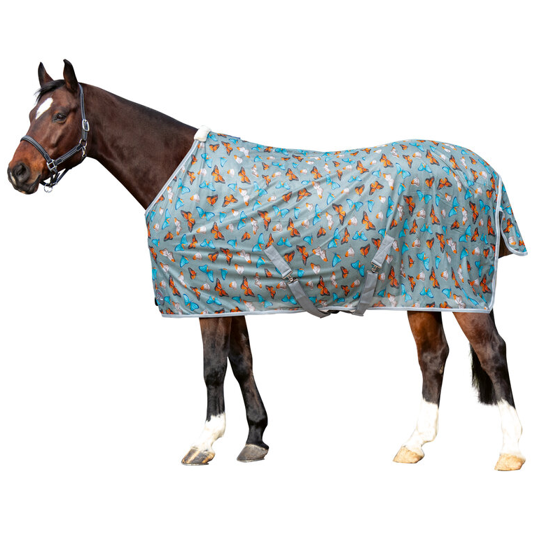 Schöne Fliegendecke mit sommerlichen Schmetterling-Print. Auf einen Blick Lieferung mit Tasche Zum Schutz des Pferdes vor Fliegen und Insekten Schmetterling-Print Schweifriemen Abgepolsterter Widerrist Hohe Reißfestigkeit Atmungsaktiv und winddurchlässig Verstell- und abnehmbare Kreuzgurte Metallverschluss vorne Die Fliegendecke Butterfly mit sommerlichem Schmetterling-Print ist ein Leichtgewicht und bietet dem Pferd an warmen Tagen einen zuverlässigen Schutz vor Insekten. Die funktionale, atmungsaktive Fliegendecke ist winddurchlässig, strapazierfähig und reißfest. Im Bereich des Widerrists